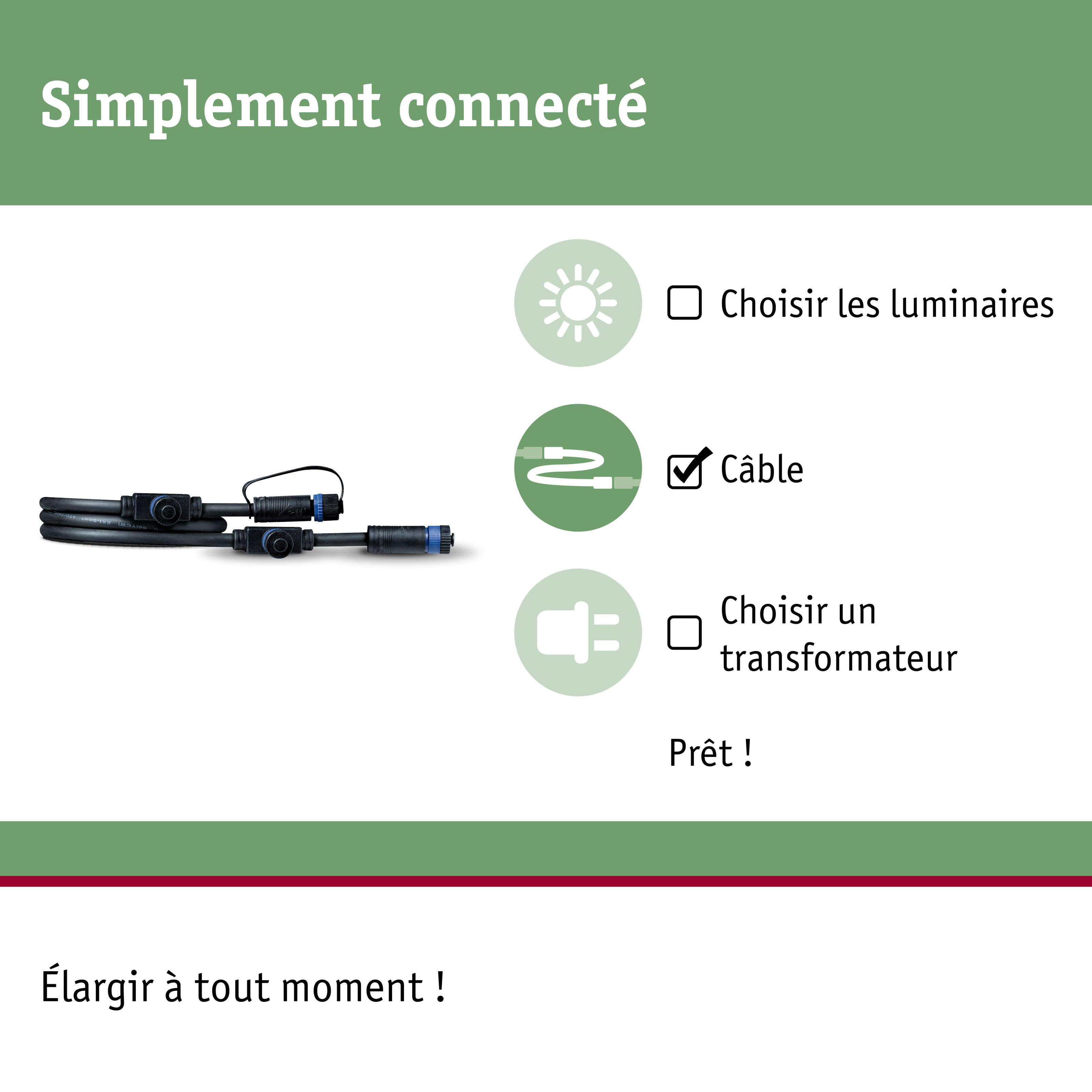 Le câble de raccordement Plug & Shine couvre jusqu'à une distance de un mètre et permet le raccordement de trois luminaires supplémentaires ou autres accessoires. Vous pouvez fermer les sorties inutilisées avec les caches fournis, afin que vous puissiez garantir la protection contre les projections d'eau IP68. En combinaison avec les luminaires et transfos de la série Plug & Shine, vous pourrez éclairer votre extérieur à votre guise : depuis le mur de la maison jusqu'aux allées du jardin et les plantes, en passant par la terrasse.