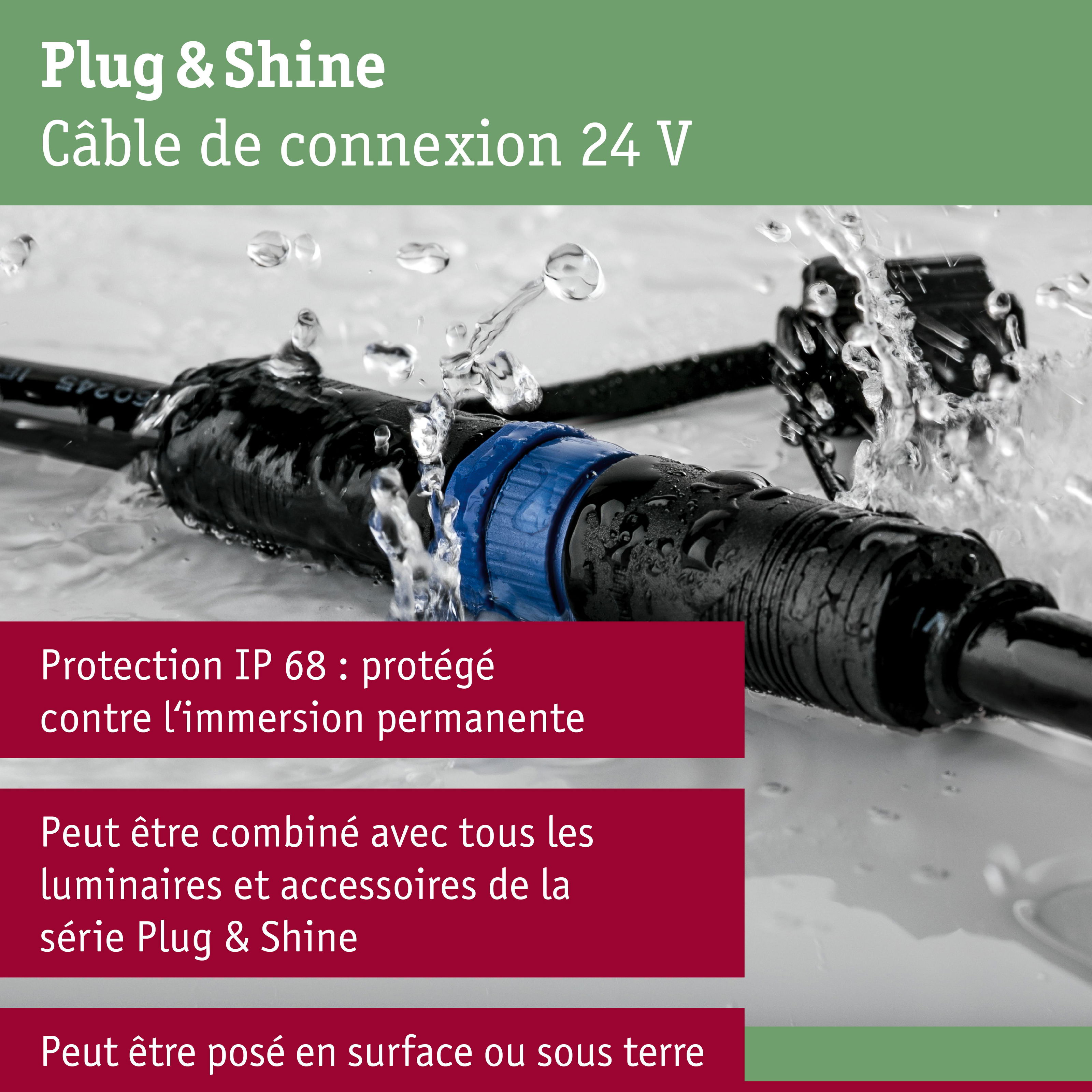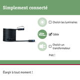 Le câble de raccordement Plug & Shine couvre jusqu'à une distance de cinq mètres et permet le raccordement de deux luminaires supplémentaires ou autres accessoires. Vous pouvez fermer les sorties inutilisées avec les caches fournis, afin que vous puissiez garantir la protection contre les projections d'eau IP68. En combinaison avec les luminaires et transfos de la série Plug & Shine, vous pourrez éclairer votre extérieur à votre guise : depuis le mur de la maison jusqu'aux allées du jardin et les plantes, en passant par la terrasse.