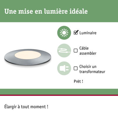 Les spots encastrés dans le sol Plug & Shine Floor Mini avec protection contre les projections d'eau agrémentent les allées, entrées et terrasses de points lumineux décoratifs dans un ton blanc chaud. Une gaine d'encastrement est fournie. Avec les transfos, connecteurs et autres luminaires de la série Plug & Shine, vous pouvez organiser en toute quiétude vos jeux de lumière pour l'extérieur. Il est impossible de marcher dessus ou de rouler dessus.