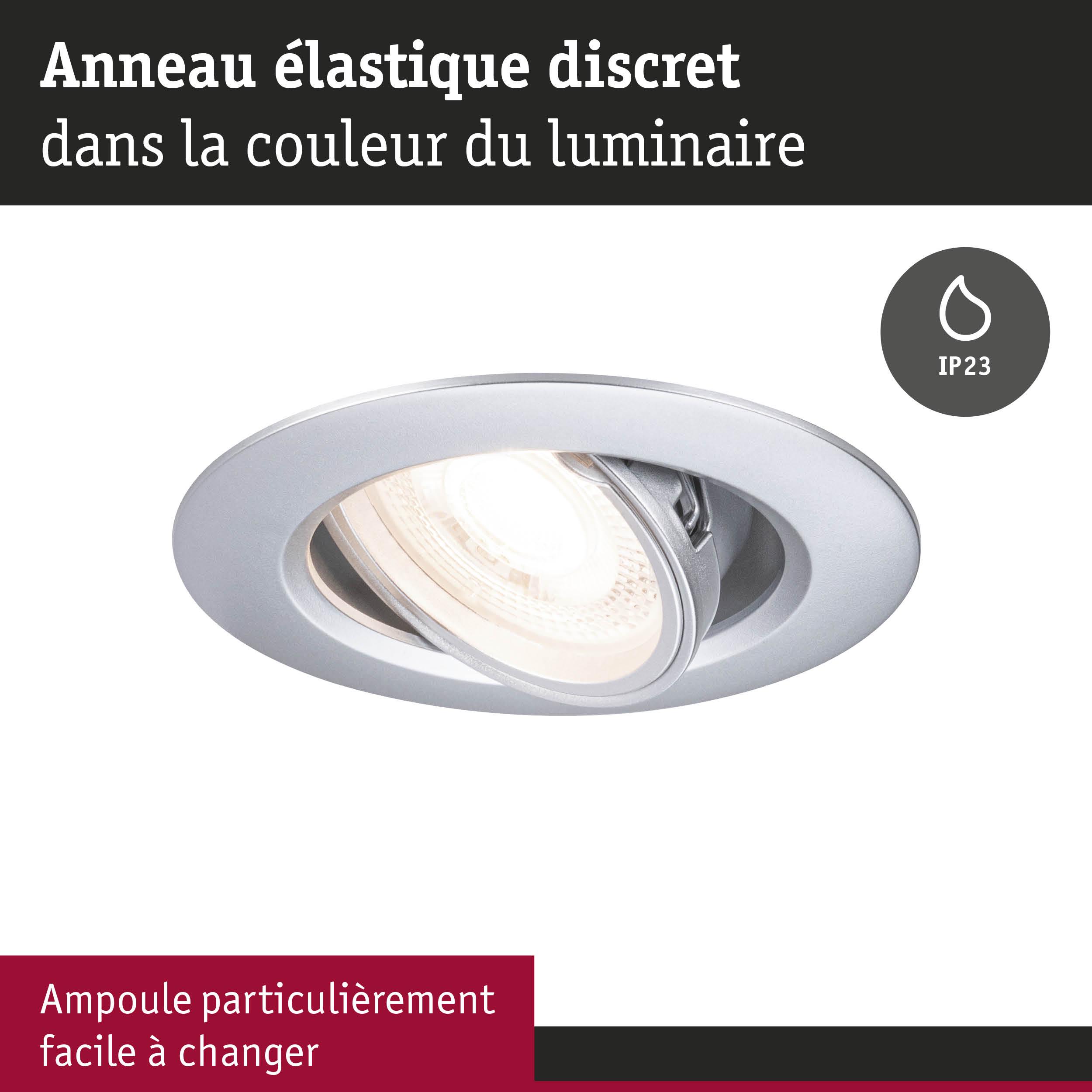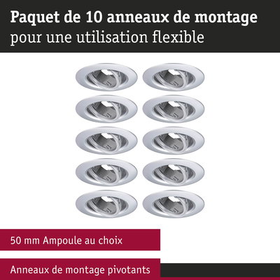 Les anneaux pivotants pour luminaires encastrés en Kit de 10 et de couleur Chrome mat en plastique sont une solution idéale pour un éclairage flexible. Le circlip discret s’adapte parfaitement au luminaire et assure un aspect harmonieux. Adapté aux ampoules d'un diamètre de 50 mm comme GU10 ou LED Coins Paulmann.