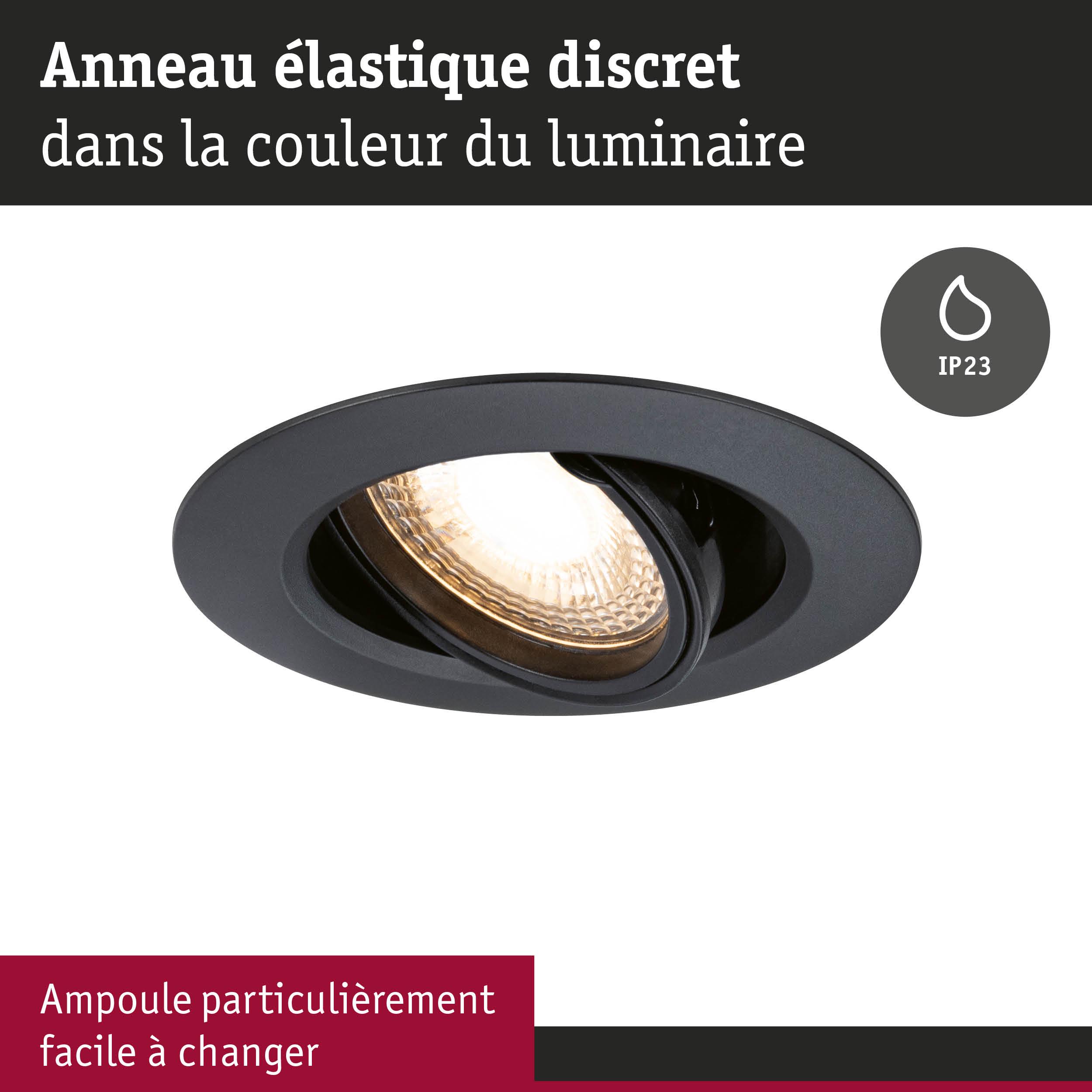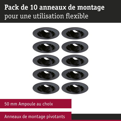 Les anneaux pivotants pour luminaires encastrés en Kit de 10 et de couleur Noir en plastique sont une solution idéale pour un éclairage flexible. Le circlip discret s’adapte parfaitement au luminaire et assure un aspect harmonieux. Adapté aux ampoules d'un diamètre de 50 mm comme GU10 ou LED Coins Paulmann.