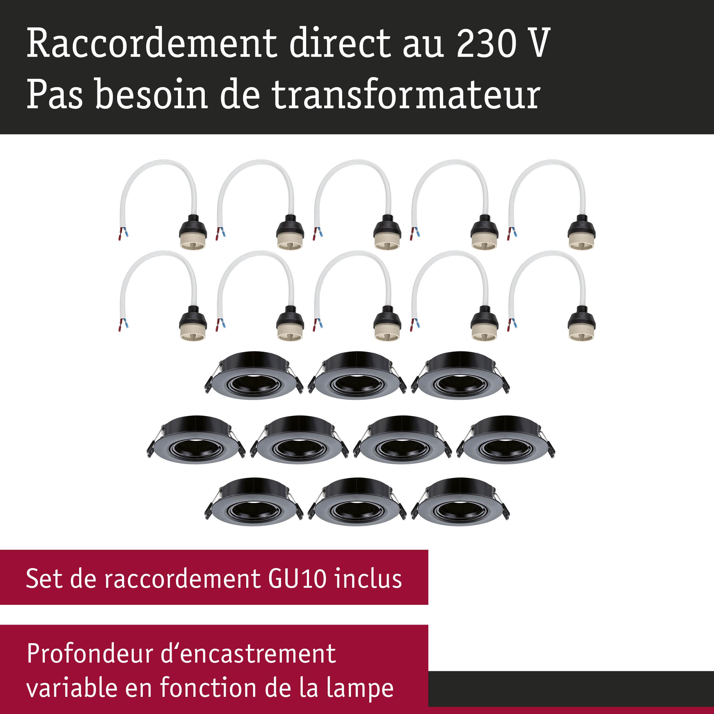 Spot encastré Kit de 10 orientable rond 90mm 30° GU10 max. 10x10W 230V gradable Noir