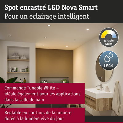 Le set de spots encastrés intelligents Nova Coin en Acier brossé avec fonction de changement de couleur confère à chaque pièce une ambiance lumineuse personnalisée. Trois ampoules LED interchangeables sont fournies avec des bagues de montage en alu de haute qualité. Grâce à une protection IP particulièrement élevée de IP44, les luminaires sont également parfaits pour les pièces humides car il est protégé contre les projections d’eau. [...] Avec une puissance de 3x6 watts et le système de contrôle Zigbee 3.0, ils fournissent une solution d'éclairage efficace et innovante. ZigBee 3.0 est un protocole de transmission radio qui met en réseau les appareils de différents fabricants. Ainsi, les luminaires peuvent être pilotés individuellement ou collectivement via une application, une télécommande ou une commande vocale : La fonction Tunable White permet de régler en continu la température de couleur en fonction des besoins, qu'il s'agisse d'une lumière dorée confortable et chaude (2200 K) ou d'un blanc lumière du jour sobre et lumineux (6500 K). Leur fonction de variation d’intensité en continu permet un ajustement individuel de la luminosité offrant deux effets majeurs : vous jouissez d'une lumière de travail claire tout en baignant dans une ambiance cocooning. Les spots encastrés intelligents peuvent être allumés et éteints facilement et confortablement à l'aide d'un interrupteur conventionnel. La fonction mémoire intégrée se souvient toujours du dernier réglage d’éclairage utilisé – pour un confort maximal. Le montage est particulièrement simple et efficace grâce aux Coins chaînables et interchangeables, à la faible profondeur d'encastrement (seulement 45 mm) et au raccordement direct en 230 V.