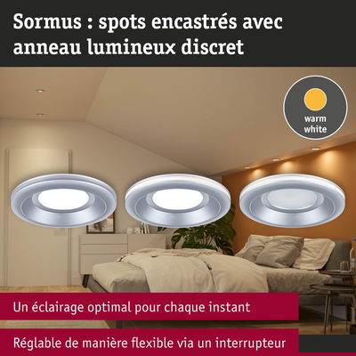 Le kit de spots encastrés Sormus (kit de 3) en Chrome mat est la solution idéale pour créer une ambiance lumineuse dans la salle de bains, où la fonctionnalité s’allie au design moderne. Avec la protection IP65, les luminaires sont préservés de la pénétration des jets d’eau et conviennent donc parfaitement pour les locaux humides ou l’extérieur. La diffusion lumineuse extra-large assure un éclairage lumineux qui, avec une température de couleur de 3000 K, plonge la pièce dans une couleur de feu blanc chaud. L’un des points forts des spots encastrés est sa commande d’éclairage flexible, qui permet de choisir entre un éclairage lumineux de la salle de bains et des accents lumineux décoratifs. En appuyant plusieurs fois sur un interrupteur conventionnel, vous pouvez choisir entre un éclairage principale, un anneau décoratif éclairé ou une combinaison des deux. Les spots encastrés Sormus présentent une profondeur d'encastrement d’à peine 55 mm, ce qui permet de les installer dans des faux plafonds peu profonds. Le boîtier de raccordement pratique permet un raccordement direct en 230 V et permet de raccorder les luminaires entre eux très facilement et sans restriction.