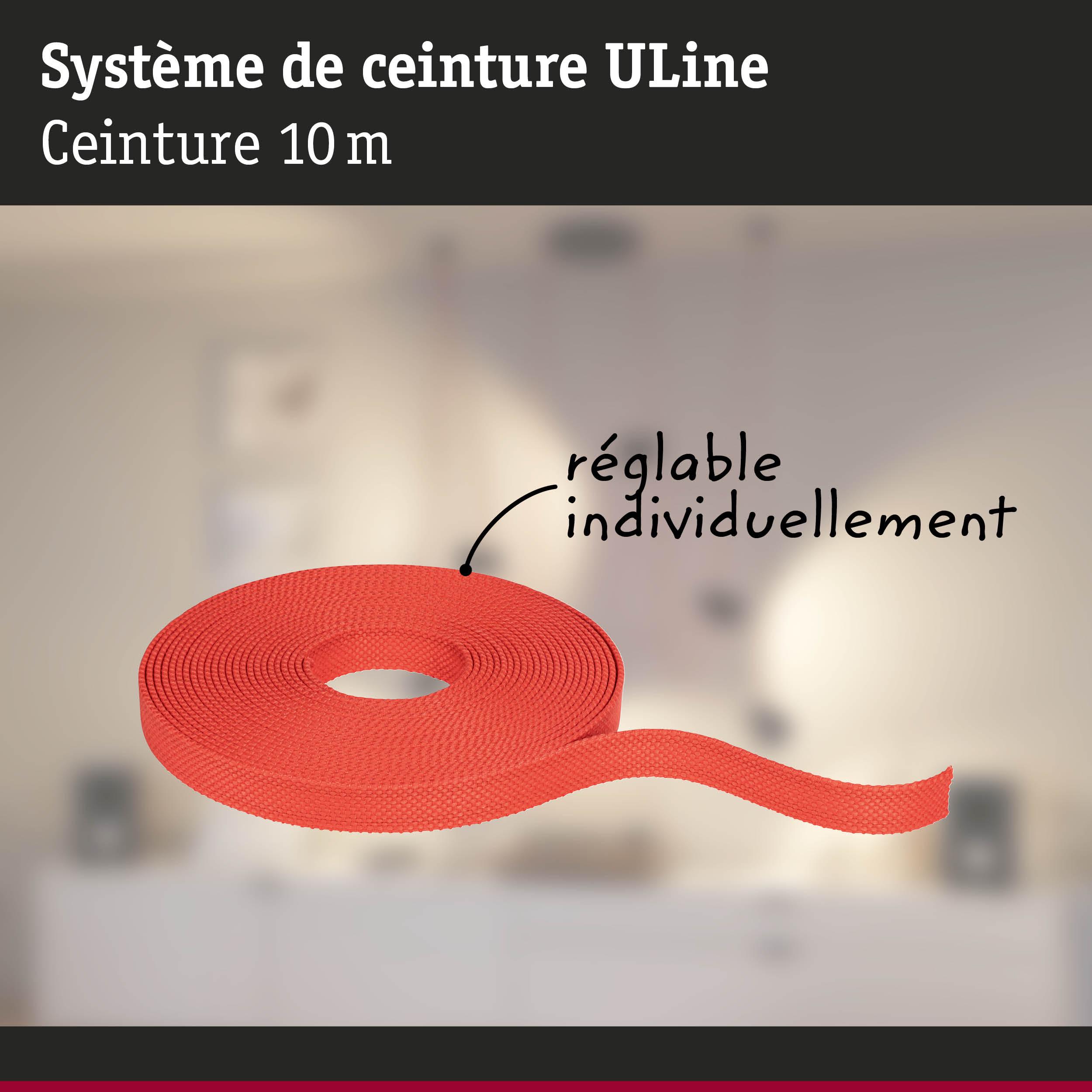 La ceinture ULine sert de base au système de ceinture ULine 48V. Disponible en deux longueurs (5 m et 10 m) et en cinq couleurs (du noir classique à l'orange exceptionnel), elle peut être placée librement dans la pièce et, si nécessaire, raccourcie à l'aide de ciseaux. Les luminaires correspondants peuvent être disposés à volonté sur la sangle. La sangle de 2,1 cm de largeur se fixe au mur, au plafond ou au sol à l'aide de supports adaptés. Il est ainsi possible de réaliser un concept d'éclairage personnel en quelques étapes. Le matériau Dacron de la sangle, résistant à la déchirure et durable, assure une durée de vie élevée et une grande capacité de charge. Les sangles sont revêtues et faciles à nettoyer. Un point fort particulier est le passage invisible du courant à l'intérieur, qui permet un aspect propre sans fils visibles. Deux embouts de finition en silicone sont inclus avec toutes les sangles pour une finition esthétique. Le système de ceinture ULine est une solution innovante pour des expériences lumineuses uniques dans toutes les dimensions de la pièce et permet une mise en scène lumineuse ciblée sur les murs, les plafonds et les sols.