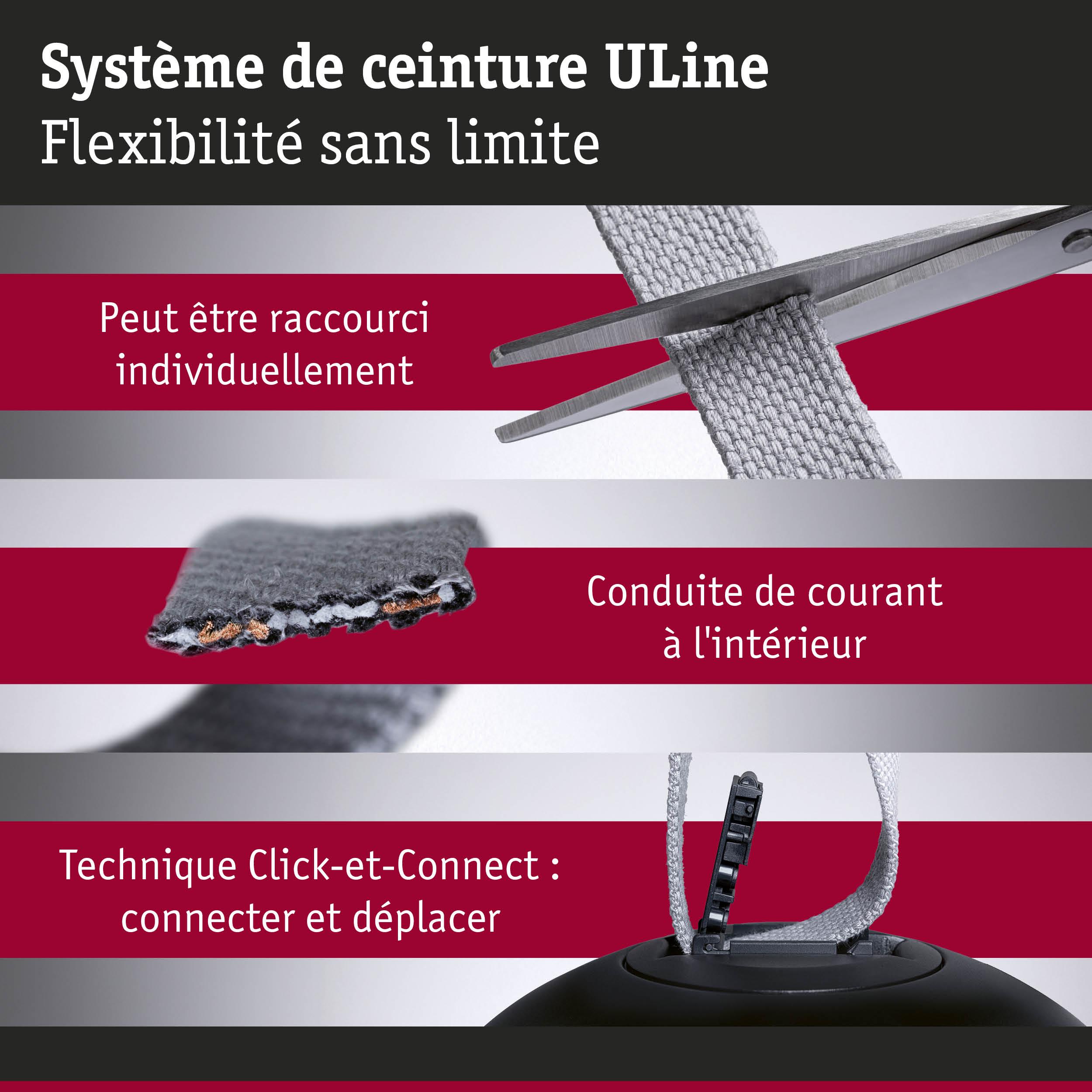 Le kit de base 150 W du système ULine fournit une base idéale pour une conception individuelle de l'éclairage. Le kit est disponible à un prix réduit et comprend une sangle noire de 5 m (94630) / 10 m (94631), des pinces, le support droit, des embouts de finition, des caches, l'alimentation électrique, un cache pour transformateur et un transformateur puissant. Des luminaires et des supports supplémentaires peuvent être ajoutés selon les besoins. Le système de sangle ULine est une solution innovante pour des expériences d'éclairage uniques dans toutes les dimensions de la pièce et permet une mise en scène lumineuse ciblée sur les murs, Decken et les sols.